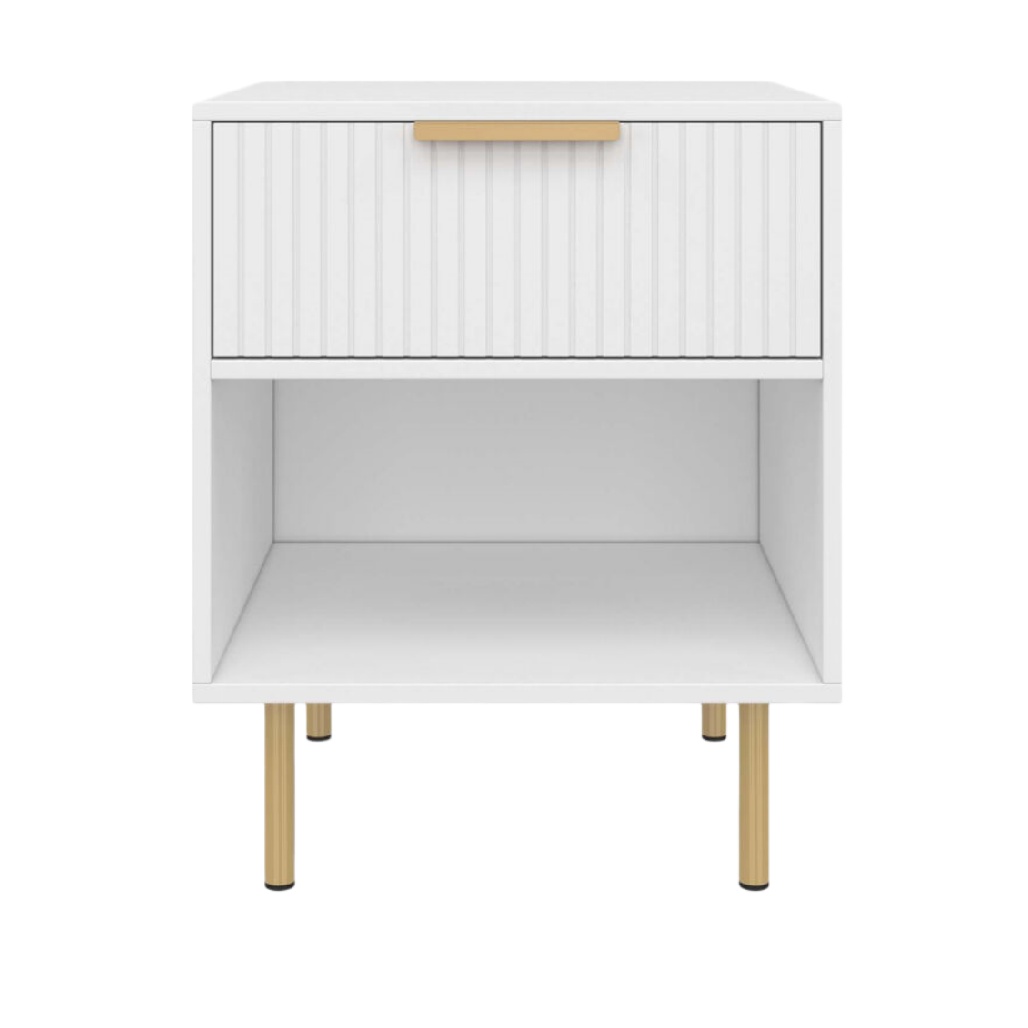 Table de chevet moderne en blanc avec tiroir strié et pieds dorés.