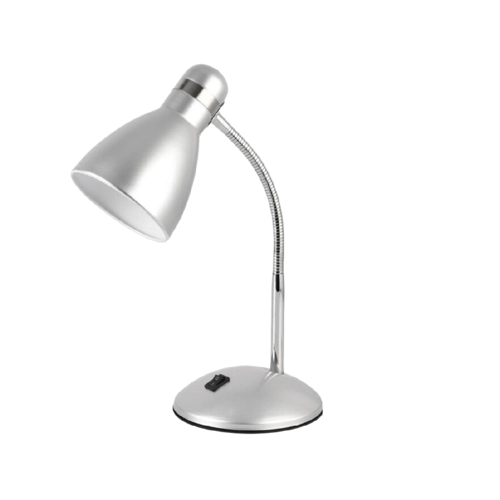 Lampe de bureau LED flexible en métal argenté avec interrupteur tactile.