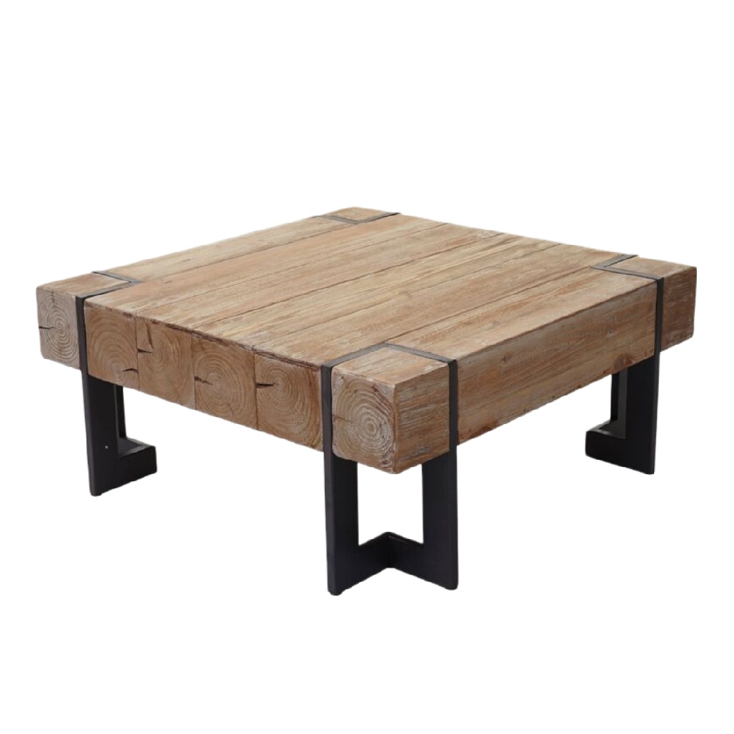Table basse en bois massif avec supports en métal noir.